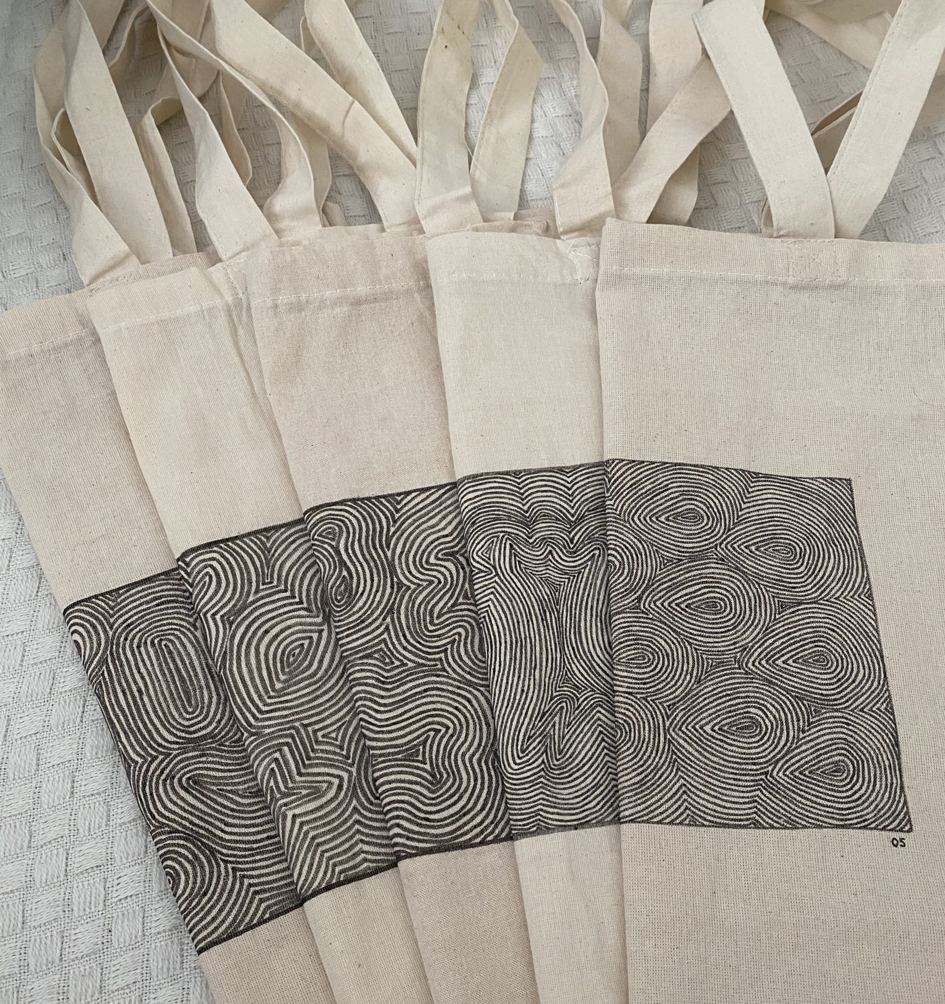 A tote bag with unique, one-of-a-kind, hand drawn design by Florrie Ransom